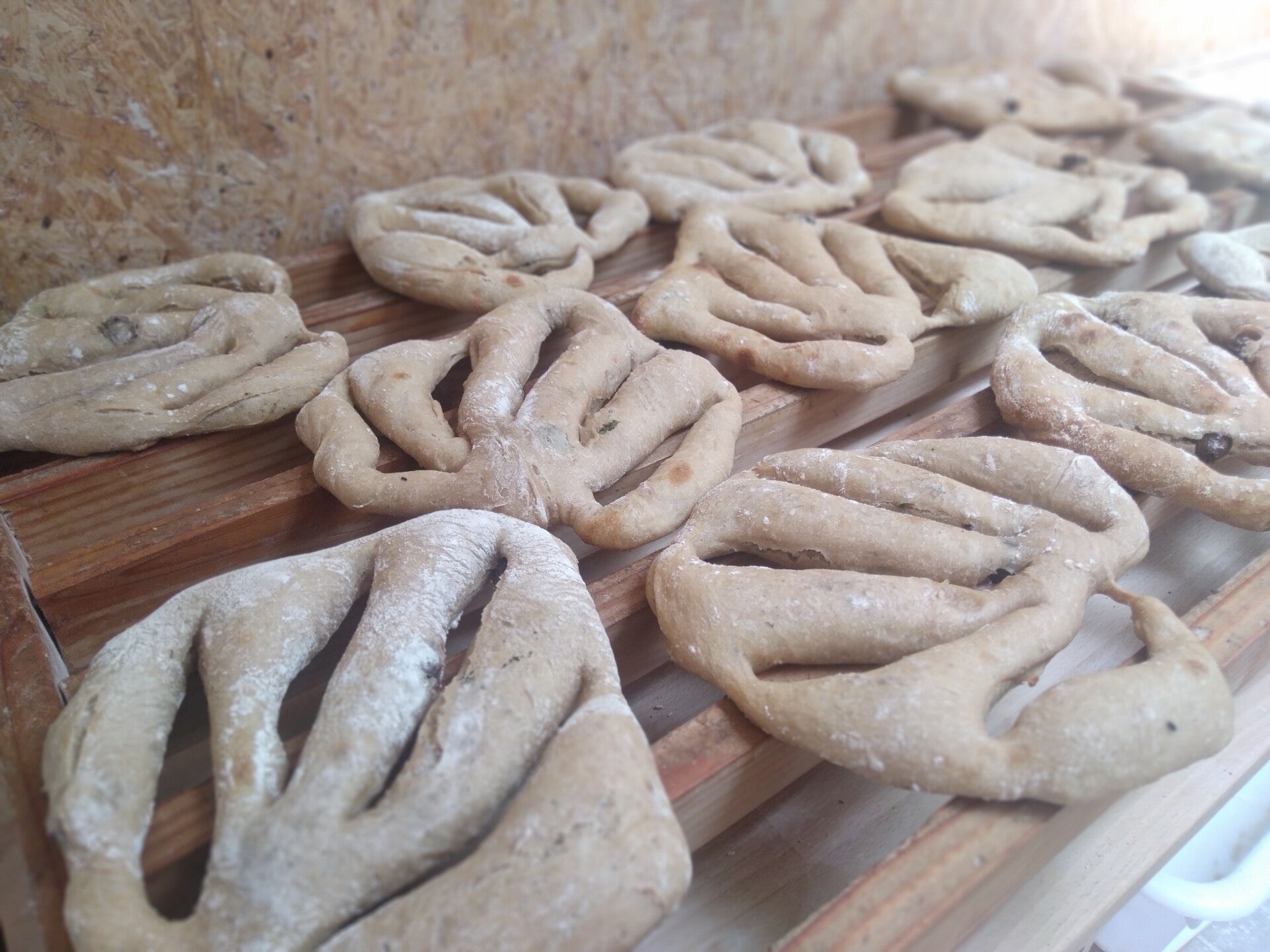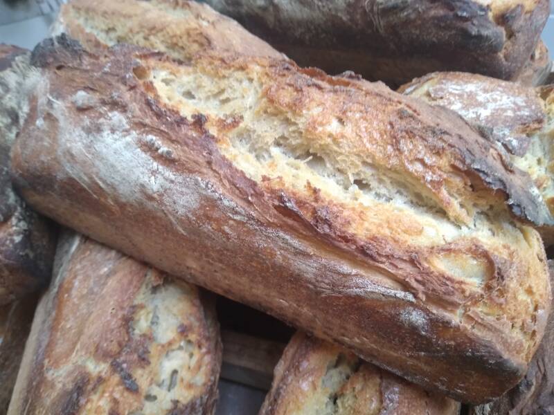 Fougasse aux olives, herbes et fleurs fraiches (4€), pain de mie(4€)...